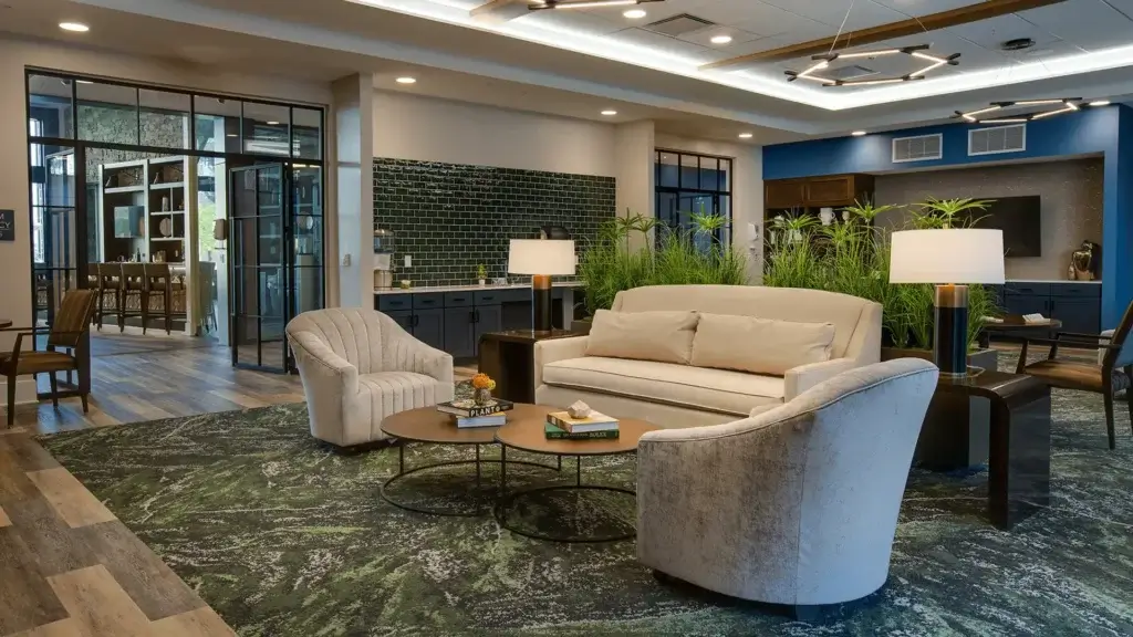 - Outdoor: pool and patio seating, umbrellas, planters, outdoor art installations, and hospitality-grade flooring